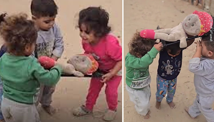 ویڈیو میں دیکھا جا سکتا ہے کہ ایک کیمپ میں موجود معصوم بچے اپنی گڑیا کے ساتھ کھیل رہے ہیں جب کہ کھیل کے دوران بچے اپنی گڑیا کو اسٹریچر پر رکھ کر جنازے کی نقل کر رہے ہیں۔